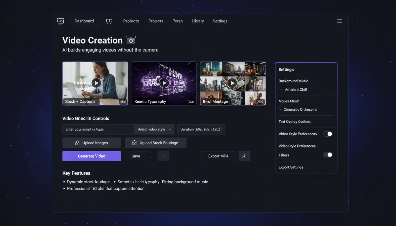 You do not need to film yourself or buy expensive equipment. Our AI builds engaging videos for you. It intelligently combines dynamic stock footage smooth kinetic typography and fitting background music. The result is professional looking TikToks that capture attention and keep people watching.