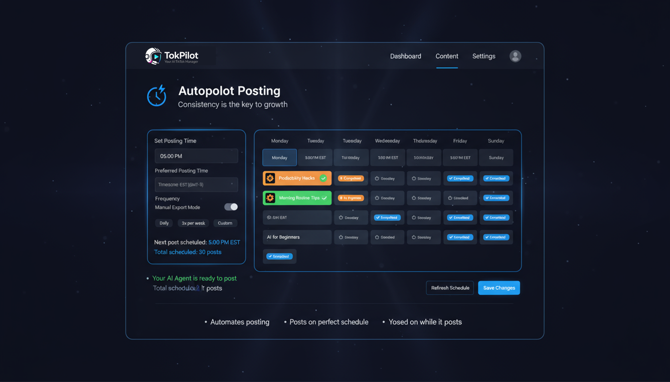 Consistency is the key to growth but it is also the hardest part. Your AI Agent solves this. Once your videos are created it automatically posts them to your TikTok account based on the perfect schedule for your audience. You just set your preferred times and your content goes live while you sleep or work on other things.